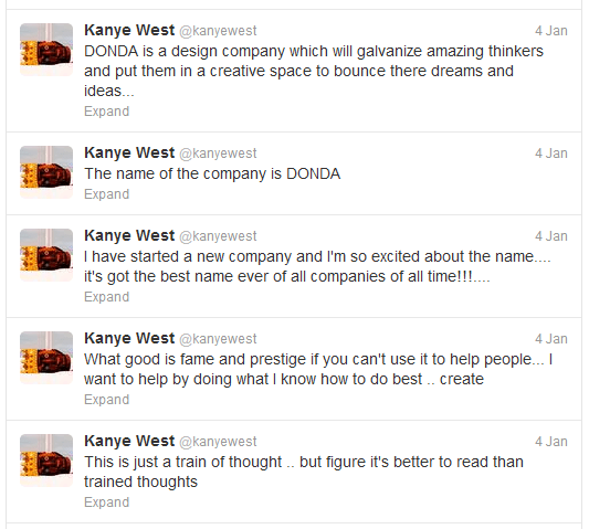 I’m not sure if anybody remembers January 4th when Kanye forgot he was using Twitter to unveil DONDA (hah, what?), but it was a ridiculous thing to witness. At the time, I had his tweets sent to my phone as text messages because he said awesome things like this: