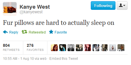 That night, I didn’t have my phone near me for a few hours. I found it and saw that I had something like 36 missed texts. About 33 of them were from Twitter. All from Kanye. And they were still coming. Obviously, I changed the mobile forwarding on Kanye’s tweets.