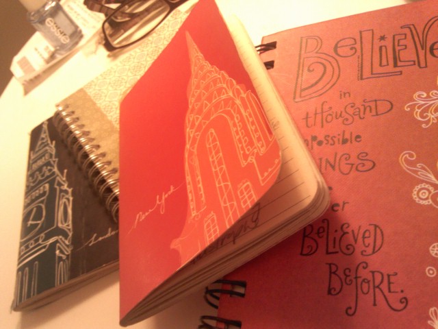 For the last year or so, I’ve been carrying around a small notebook with me. I like it to be small enough to tuck in my purse no matter what the size, though that point is pretty irrelevant, since I tend to carry what my mother and father call “luggage”. What? I need to. I need my wallet that’s stuffed with my last 50 receipts, 5 different kinds of chapstick, three colors of lipstick (which I rarely wear), my cell phone, my Kindle (I know, there’s a Kindle app, but I hate reading on backlit screens), and possibly a book. Anyway, this notebook. I got the idea from reading a David Sedaris essay where he talks about the notebook he carries around.