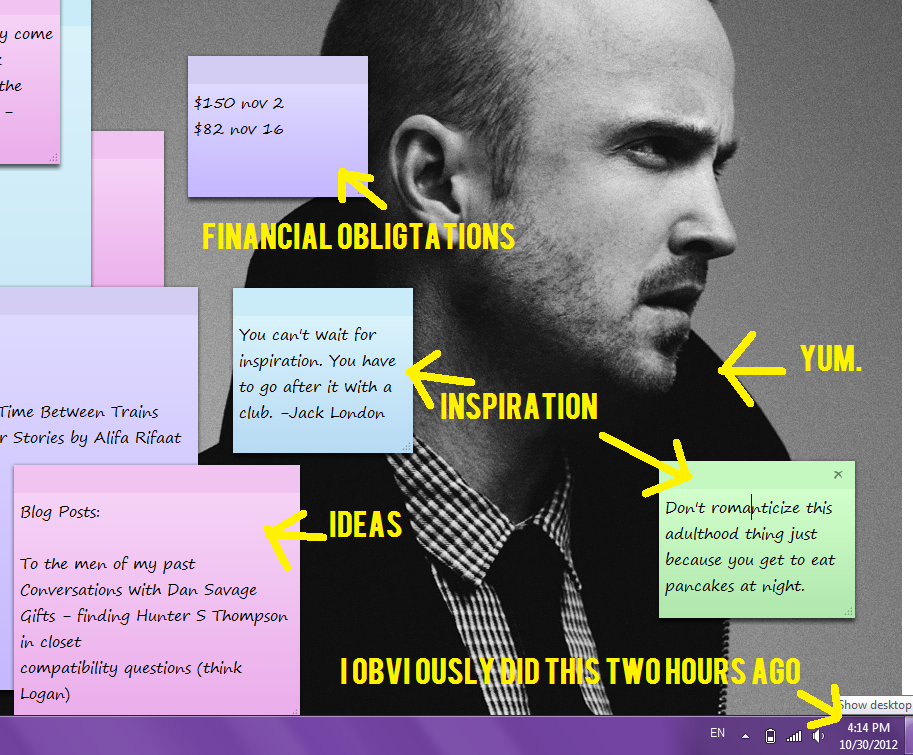 I minimized all my windows earlier this afternoon because I remembered I had changed my background to a smoldering picture of Aaron Paul. To see it, I had to minimize my sticky notes which I then rearranged so his face wasn’t covered. These notes’ lifespans vary from months to days. Why I have such a hard time deleting them is a mystery. One is titled “TO READ”, a list of books I want to read. It’s only been referenced once in the last year. Other notes contain quotes intended to inspire me to write, which would probably be effective if they weren’t covered up by Facebook.