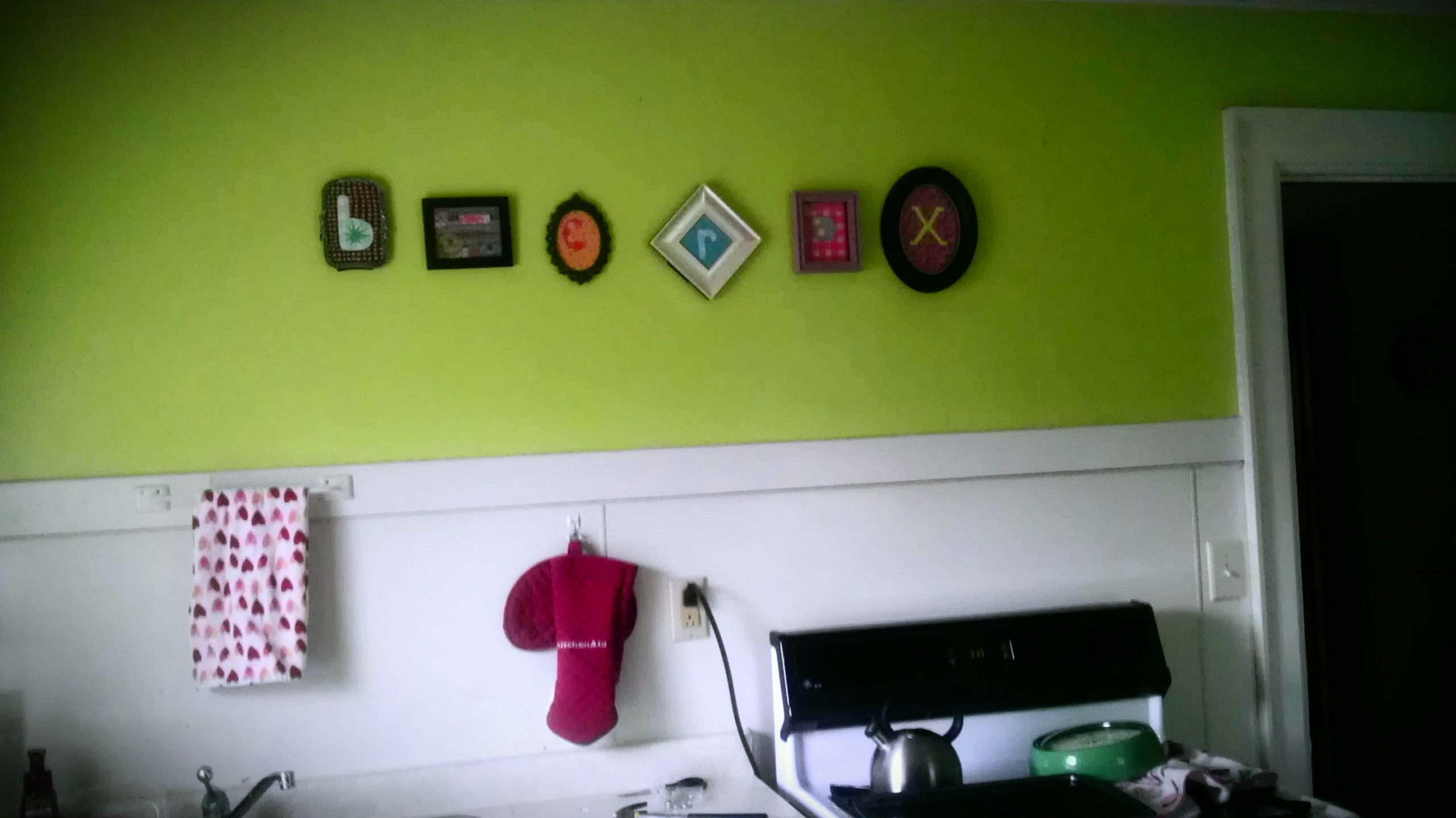 When I had my housewarming party a few weeks ago, Andrea and Nicole presented me with a gift of a hula hoop (which I used once and has been leaning against a wall after it fell around my ankles) and a handmade installment of miniature frames that spell out B-Crox. It looks pretty awesome in my kitchen.